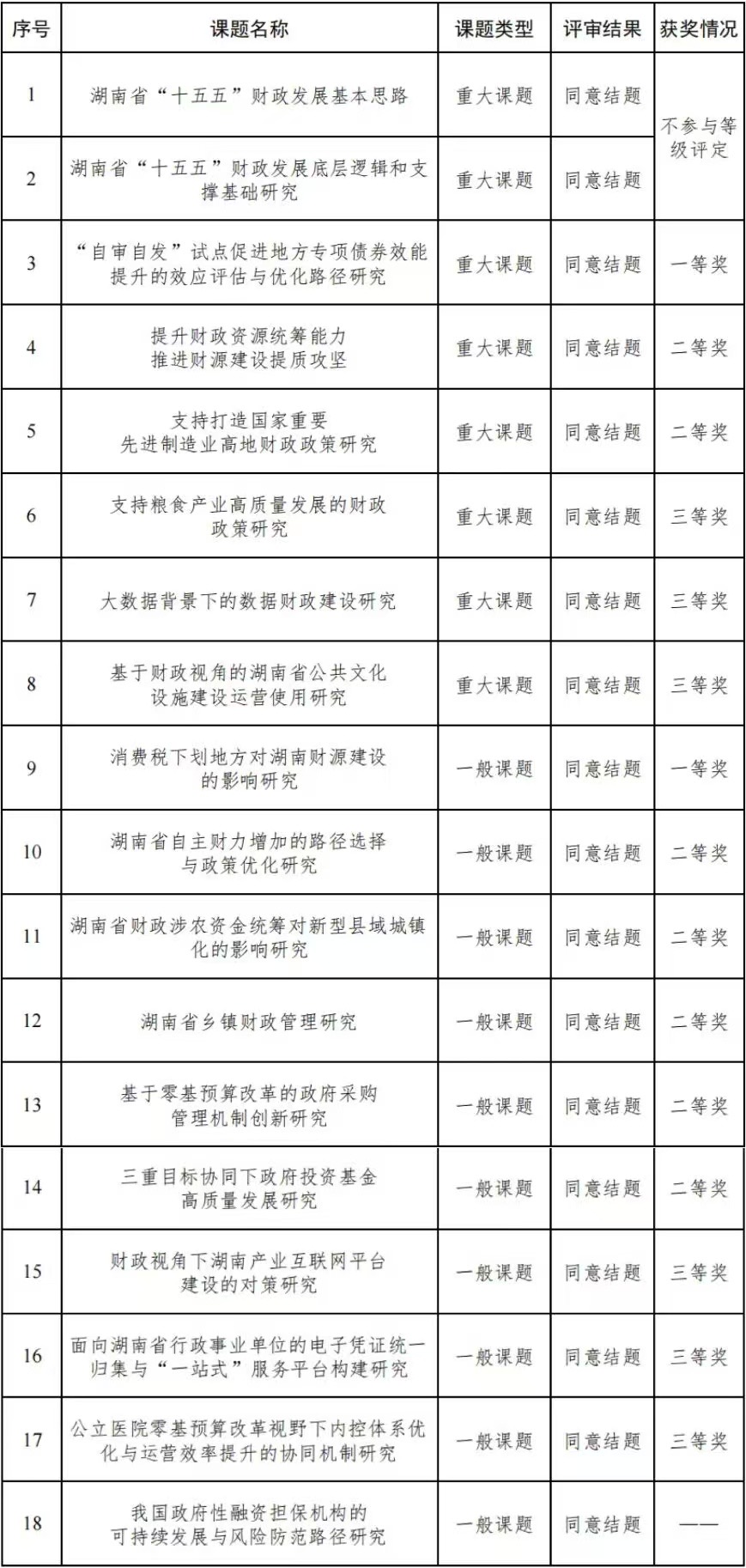 湖南财政与经济发展研究中心(以下简称中心)是湖南省财政厅与无码av 、湘潭大学、湖南财政经济无码av 合作共建的全省财政科研基地。2025年,中心公开立项课题18项,其中,重大课题8项、一般课题10项,经专家评审,均同意结题。现将评审结果公告如下: