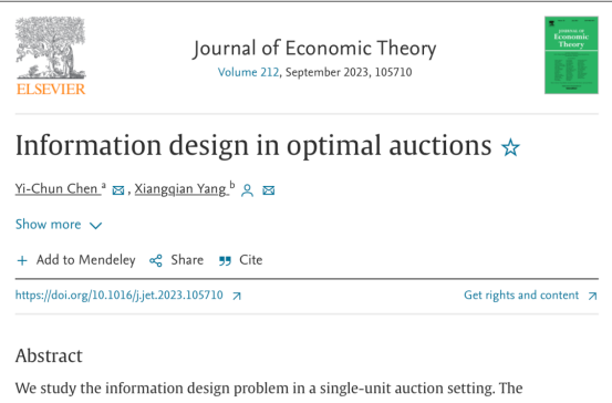 杨湘黔助理教授作为通讯作者与合作者Yi-Chun Chen教授(来自新加坡国立大学)合作撰写的论文“Information design in optimal auctions”(作者名按字母序排列)在国际公认的经济学顶级期刊Journal of Economic Theory正式online见刊。